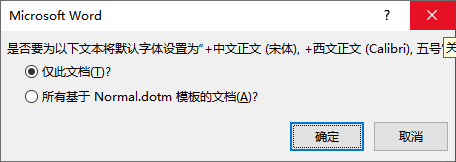 ③ 设置默认值,设置好默认的样式后,单击【设为默认值】按钮,此时会弹出一个选择框,提示更改应用范围,有【仅用于此文档】与【所有基于Normal.dotm模版的文档】两个,前者意思只用于当前文档,后者则是应用于本机所有新建的word文档。点击确定后即完成了更改word默认字体样式的操作。